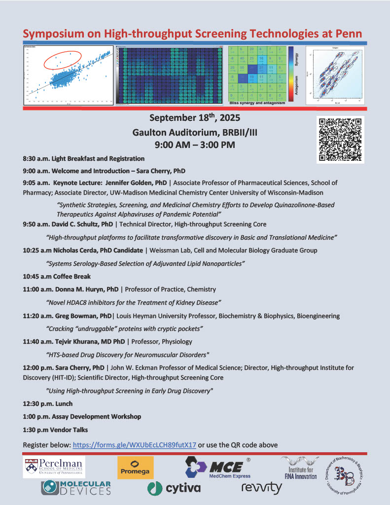 The UPenn High-throughput Screening Core (HTSC) and the High-Throughput Institute for Discovery (HIT-ID) is hosting a symposium on Thursday September 18th, 2025 in the Gaulton Auditorium, BRB II/III from 9:00 AM to 3:00 PM and is open all faculty, postdocs, graduate students, and laboratory staff free of charge. We are delighted that Jennifer Golden, PhD from the University of Wisconsin-Madison will give the Keynote Address on development of antivirals against emerging pathogens. In addition, investigators at PENN will present their studies using high-throughput screening in basic science and drug discovery. The symposium will highlight resources and capabilities of the HTSC, and demonstrate how high-throughput screening can impact basic and translational medicine across disciplines. Program details and additional information will be available soon. Please use the QR code below to register.