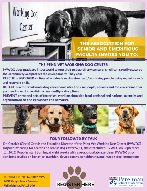 Tour Followed by talk: Dr. Cynthia (Cindy) Otto is the Founding Director of the Penn Vet Working Dog Center (PVWDC). Inspired by caring for search and rescue dogs after 9/11, she established PVWDC on September 11, 2012. Puppies start training at eight weeks with age-appropriate exercises. PVWDC also conducts studies on behavior, nutrition, development, conditioning, and human-dog interactions. Register Here