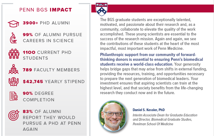 Recent cuts and uncertainty around NIH funding have led to a significant reduction in BGS’s incoming class. This means fewer promising scientists can access the kind of rigorous, high-impact training that prepares them to lead in academia, industry, biotech, and pharma. This loss impacts the pace of discovery, the strength of our research enterprise, and Penn’s ability to lead in biomedical innovation and education.