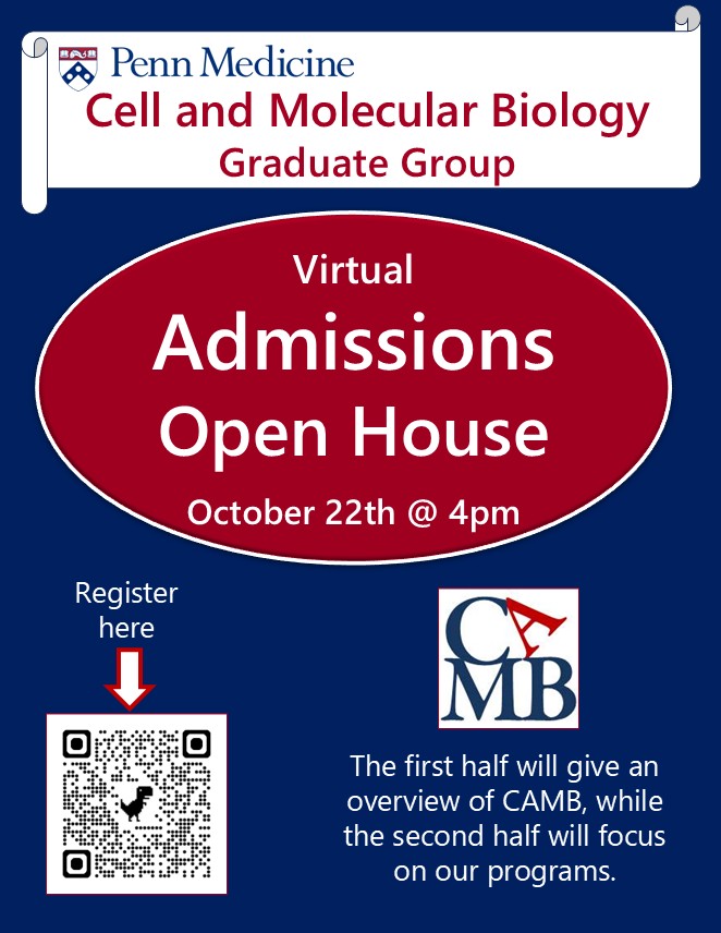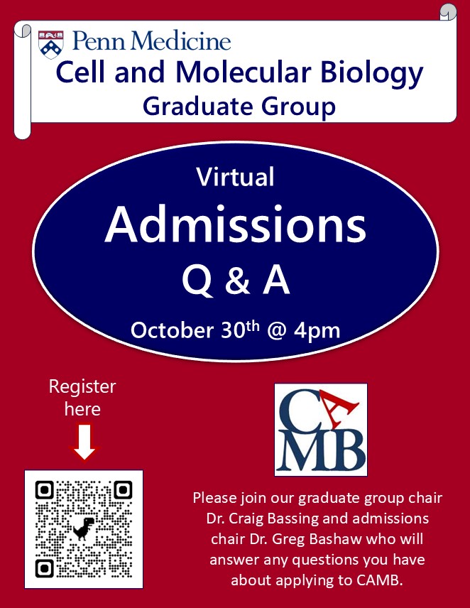 - CAMB Virtual Q&A October 30th, 4:00 pm- a discussion with graduate group chair Dr. Craig Bassing and admissions chair Dr. Greg Bashaw. Register here.