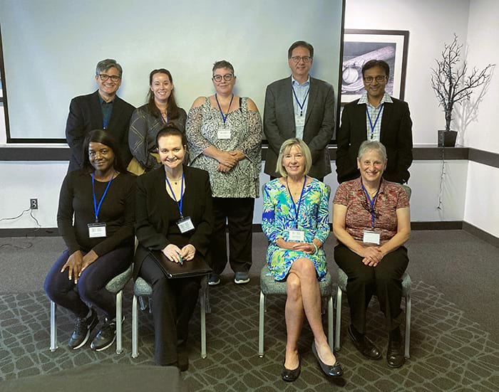 2023 Patient Advocates (bottom row) Shianne Lee and Anna Hedden with the Powell-Drescher OCRF, Dianne Weidman with the Ovarian Cancer Alliance of Greater Cincinnati, and Deborah Binder with the Amy Krouse Rosenthal Foundation. Top row: Dean Ken Nephew with ECI panel moderator Rachel Vogel, DOD Science Officer Melanie Neagley, Deputy Dean Ronny Drapkin, and OCRP Program Manager Sagar Ghosh