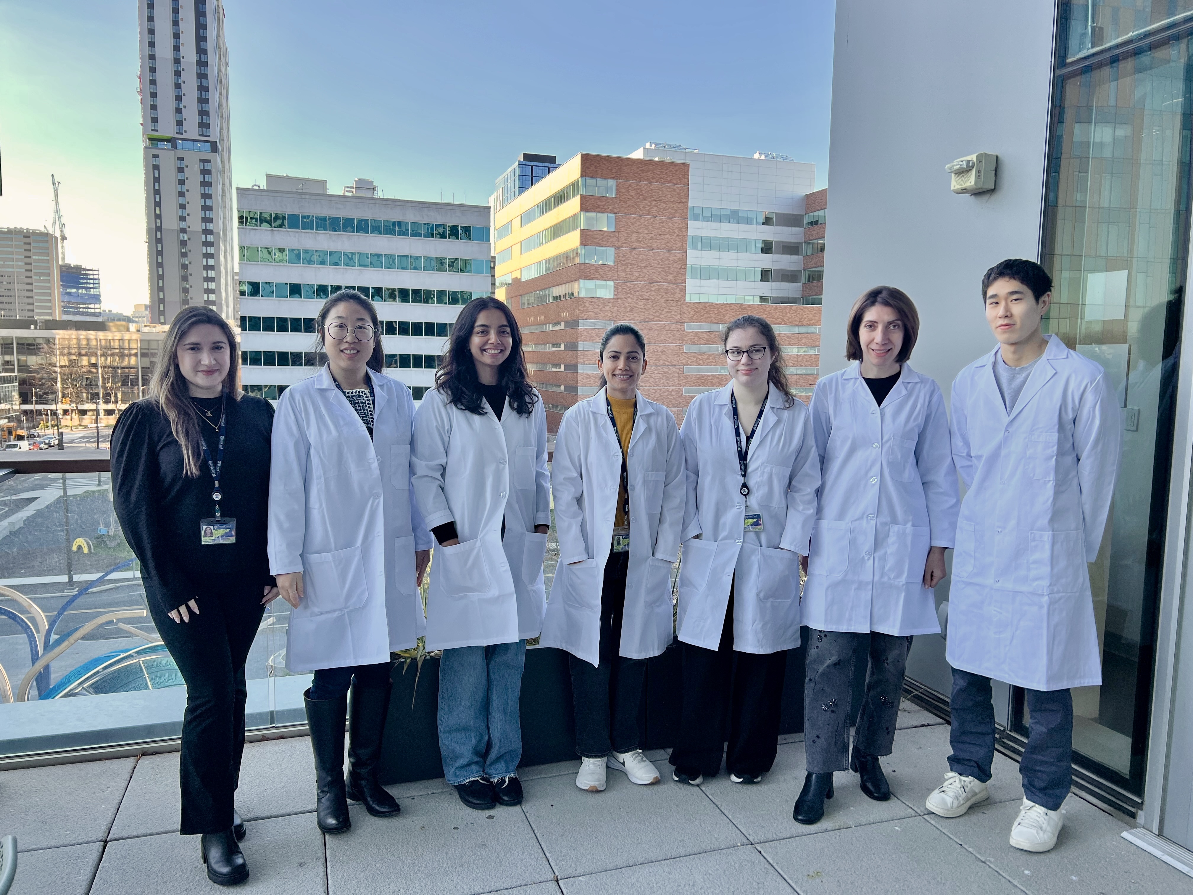 The Hambardzumyan team members on the third-floor balcony of One uCity: from left to right, Kejda Oreshkovic, Jacqueline Chu, Tanvi Joshi, Kavita Rawat, Angela DiMauro, Dolores Hambardzumyan and Nathan Yu.