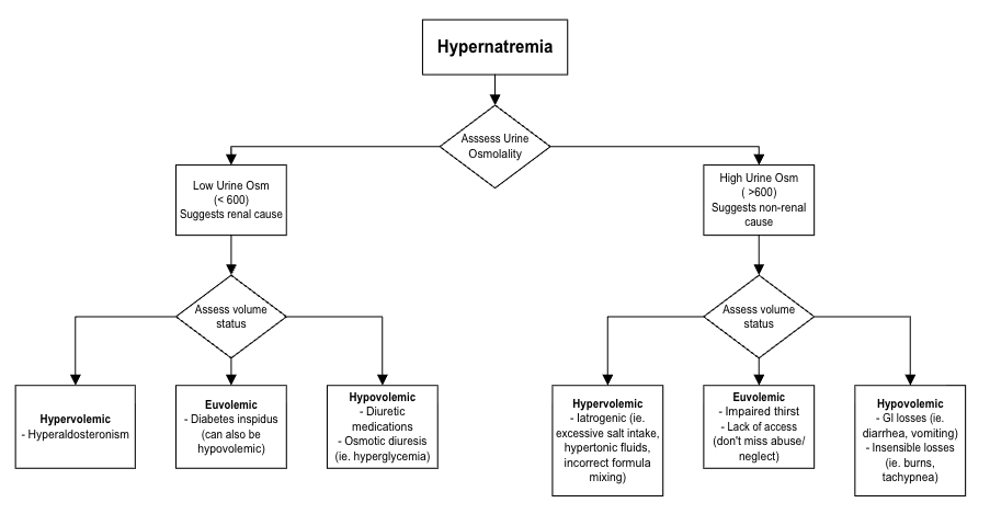 - Abnormal sodium levels are usually related to water balance. When investigating etiology, it is often helpful to assess volume status and measurements of serum and urine osmolality.