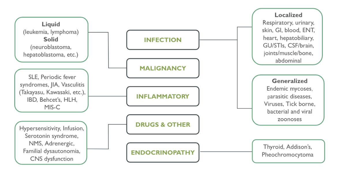 In pediatrics, fever is most often going to be due to infection, but consider “zebras” (rheumatologic, hematologic, oncologic, immunologic) if you see concerning symptoms like weight loss (acute or chronic), bloody stool, severe lab abnormalities