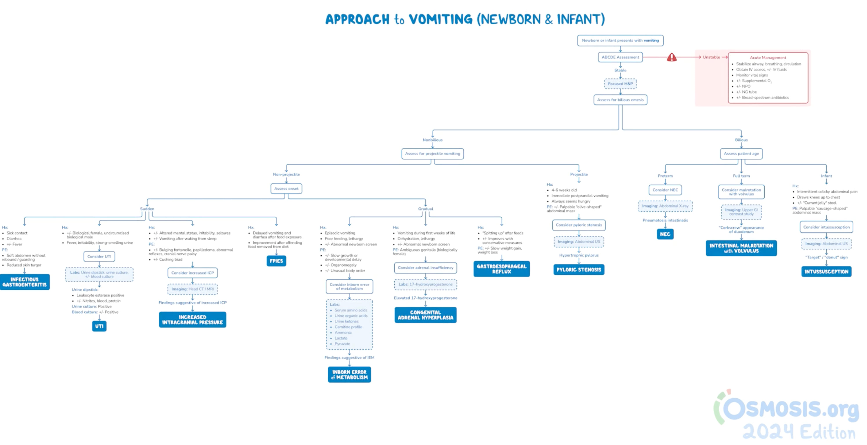 - Consider abdominal X-ray, pyloric ultrasound, or upper GI series to evaluate for obstruction or anatomic abnormality. If there are neurologic concerns, obtain brain imaging to evaluate for elevated ICP.